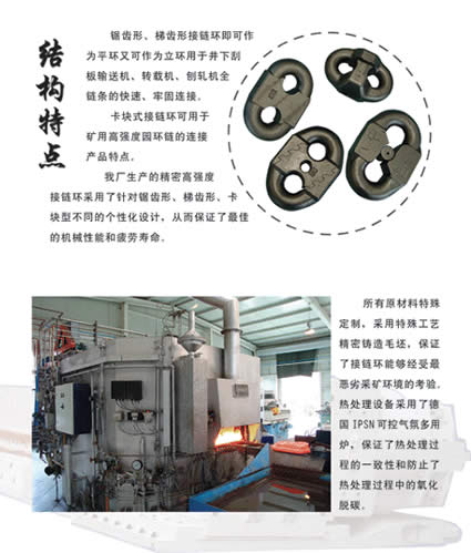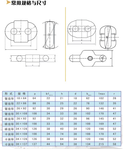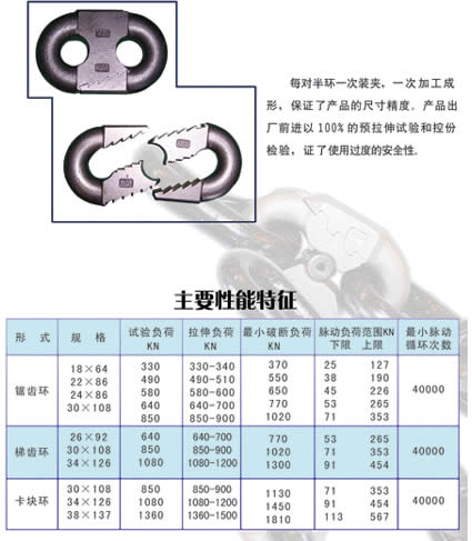 矿用圆环链用开口式连接环22×86 C 试验负荷:415kN。试验负荷下最大伸长率:≤2 ;% ;。最小破断负荷:≥550kN。破断后永久伸长率:≥ 8 ;% ;。脉动负荷范围(kN):下限38 上限190。最小脉动循环次数:40000。