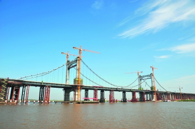 记者从哈尔滨市建委西部路网工程建设指挥部了解到,28日,阳明滩大桥主桥已顺利完成受力体系转换,起初用于临时支撑主桥的支墩已开始拆除,吊索开始受力。自此,扛起重达2万吨的阳明滩大桥主桥的任务完全落在了196根吊索和主缆身上。本报记者 孙殿喜 摄