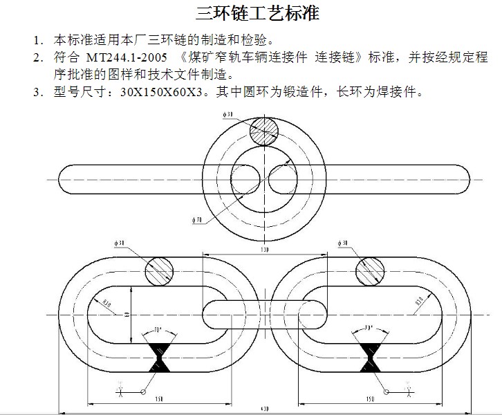 矿车三环链适用于运输煤炭、矸石、物料等各类矿车和林业木材运输联接,在符合《煤矿保安规程》的前提下也适用于矿山人的联接